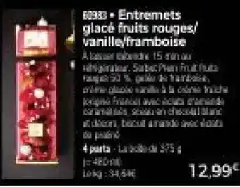 Le prix de l'offre Entremets glacé fruits rouges, vanille,framboise se trouve également en haut de la page, ainsi que la date à laquelle l'offre est disponible. Vous pouvez également vérifier les prix dans le Catalogue Thiriet actuel ou sur le site Internet de Thiriet. Les offres vous permettent d'acheter les produits Thiriet au prix le plus bas.