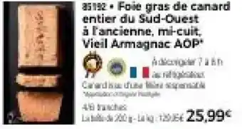 En plus de l'offre Foie gras de canard entier du sud-ouest à l'ancienne, mi-cuit, vieil armagnac aop, Thiriet propose une large gamme de produits. Consultez le Catalogue Thiriet hebdomadaire pour découvrir les meilleures offres et promotions. En plus de Foie gras de canard entier du sud-ouest à l'ancienne, mi-cuit, vieil armagnac aop, il y a aussi : 2 tranches de foie gras de canard entier du sud-ouest, cuit au torchon - armagnac aoc, Foie gras de canard entier du sud ouest maistres occitans & Bloc de foie gras de canard du sud-ouest.