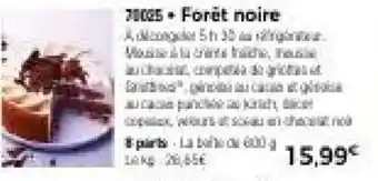 L'offre est disponible dans plusieurs magasins, vérifiez tous les produits pour obtenir le Forêt noire le moins cher. Si vous souhaitez savoir si l'article est en vente avec une plus grosse remise dans un autre magasin, consultez la catégorie 'Supermarché'. Ces offres pourraient aussi vous intéresser : Forêt noire, Forêt noire & Foret noire 6 parts.