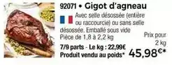 L'offre est disponible dans plusieurs magasins, vérifiez tous les produits pour obtenir le Gigot d'agneau le moins cher. Si vous souhaitez savoir si l'article est en vente avec une plus grosse remise dans un autre magasin, consultez la catégorie 'Supermarché'. Ces offres pourraient aussi vous intéresser : Tranches de gigot d'agneau, Demi gigot d'agneau & L'etal du boucher - demi gigot d'agneau.
