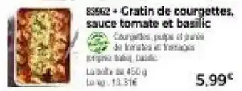 L'offre est disponible dans plusieurs magasins, vérifiez tous les produits pour obtenir le Gratin de courgettes, sauce tomate et basilic le moins cher. Si vous souhaitez savoir si l'article est en vente avec une plus grosse remise dans un autre magasin, consultez la catégorie 'Supermarché'. Ces offres pourraient aussi vous intéresser : Sauce tomate basilic, Préfou tomate,basilic & Sauce Tomate Barilla.