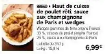 Le prix de l'offre Haut de cuisse de poulet röti, sauce aux champignons de paris et wedges se trouve également en haut de la page, ainsi que la date à laquelle l'offre est disponible. Vous pouvez également vérifier les prix dans le Catalogue Thiriet actuel ou sur le site Internet de Thiriet. Les offres vous permettent d'acheter les produits Thiriet au prix le plus bas.