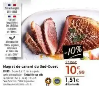L'offre est disponible dans plusieurs magasins, vérifiez tous les produits pour obtenir le Magret de canard du sud-ouest le moins cher. Si vous souhaitez savoir si l'article est en vente avec une plus grosse remise dans un autre magasin, consultez la catégorie 'Supermarché'. Ces offres pourraient aussi vous intéresser : Magret de Canard IGP du Sud-Ouest, MAGRET DE CANARD DU SUD-OUEST SÉCHÉ OU FUMÉ MAISON MONTFORT & Magret de canard igp du sud-ouest x1.