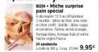 L'offre est disponible dans plusieurs magasins, vérifiez tous les produits pour obtenir le Miche surprise pain spécial le moins cher. Si vous souhaitez savoir si l'article est en vente avec une plus grosse remise dans un autre magasin, consultez la catégorie 'Supermarché'. Ces offres pourraient aussi vous intéresser : Miche surprise pain spécial aux noix, Miche surprise pain spécial suédois & Miche surprise pain spécial aux céréales.