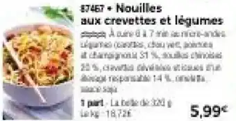 L'offre est disponible dans plusieurs magasins, vérifiez tous les produits pour obtenir le Nouilles aux crevettes et légumes le moins cher. Si vous souhaitez savoir si l'article est en vente avec une plus grosse remise dans un autre magasin, consultez la catégorie 'Supermarché'. Ces offres pourraient aussi vous intéresser : Nouilles sautées aux légumes, NOUILLES AUX LÉGUMES ET SAUCE SOJA & Nouilles aux légumes et sauce soja.