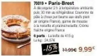 L'offre est disponible dans plusieurs magasins, vérifiez tous les produits pour obtenir le Paris-brest le moins cher. Si vous souhaitez savoir si l'article est en vente avec une plus grosse remise dans un autre magasin, consultez la catégorie 'Supermarché'. Ces offres pourraient aussi vous intéresser : Paris-brest, Paris brest & Paris brest.