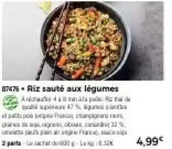 L'offre est disponible dans plusieurs magasins, vérifiez tous les produits pour obtenir le Riz sauté aux légumes le moins cher. Si vous souhaitez savoir si l'article est en vente avec une plus grosse remise dans un autre magasin, consultez la catégorie 'Supermarché'. Ces offres pourraient aussi vous intéresser : Sauté de porc, Sauté de veau & Poulet au curry légumes et riz.