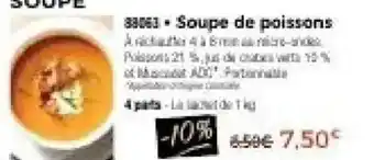 L'offre est disponible dans plusieurs magasins, vérifiez tous les produits pour obtenir le Soupe de poissons le moins cher. Si vous souhaitez savoir si l'article est en vente avec une plus grosse remise dans un autre magasin, consultez la catégorie 'Supermarché'. Ces offres pourraient aussi vous intéresser : Soupe de poissons, Soupe de poissons & Soupe de poissons et langoustines.