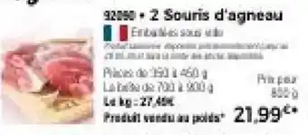L'offre est disponible dans plusieurs magasins, vérifiez tous les produits pour obtenir le Souris d'agneau le moins cher. Si vous souhaitez savoir si l'article est en vente avec une plus grosse remise dans un autre magasin, consultez la catégorie 'Supermarché'. Ces offres pourraient aussi vous intéresser : Sauté d'agneau, Côtes d'agneau & Cigot d'agneau.