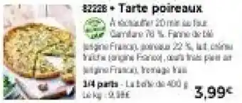 L'offre est disponible dans plusieurs magasins, vérifiez tous les produits pour obtenir le Tarte poireaux le moins cher. Si vous souhaitez savoir si l'article est en vente avec une plus grosse remise dans un autre magasin, consultez la catégorie 'Supermarché'. Ces offres pourraient aussi vous intéresser : Tarte saumon,poireaux, LES CHEFS DU BIO Tarte poireaux & 2 Tartes poireaux.