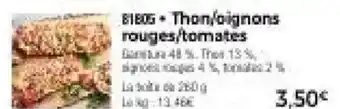 L'offre est disponible dans plusieurs magasins, vérifiez tous les produits pour obtenir le Thon,oignons rouges,tomates le moins cher. Si vous souhaitez savoir si l'article est en vente avec une plus grosse remise dans un autre magasin, consultez la catégorie 'Supermarché'. Ces offres pourraient aussi vous intéresser : Tartare - verrines de tomates au thon, Mini farfalles thon et tomates & Verrines tartare de tomates au thon.