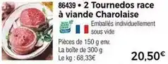L'offre est disponible dans plusieurs magasins, vérifiez tous les produits pour obtenir le Tournedos race a viande charolaise le moins cher. Si vous souhaitez savoir si l'article est en vente avec une plus grosse remise dans un autre magasin, consultez la catégorie 'Supermarché'. Ces offres pourraient aussi vous intéresser : 2 entrecôtes race à viande charolaise, 2 faux-filets race à viande charolaise & Collier et basse côte pour bourguignon race à viande charolaise.