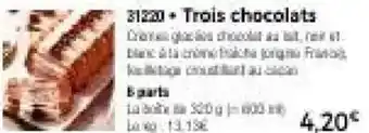 Actuellement, Trois chocolats est en promotion chez Thiriet. Toutes les informations utiles comme le prix, les conditions et la durée de validité sont affichées sur cette page. Consultez également les promotions similaires pour Trois chocolats, afin de faire le meilleur choix. La promo Trois chocolats est valable du 01-03-2026 au 23-06-2026. Si elle est expirée, regardez les autres offres équivalentes. Vous pouvez aussi suivre cette catégorie de produit pour être alerté lorsqu’une nouvelle promotion Trois chocolats apparaît chez Thiriet.Questions fréquemment posées au sujet de Trois chocolats