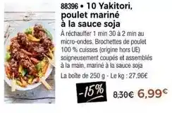 L'offre est disponible dans plusieurs magasins, vérifiez tous les produits pour obtenir le Yakitori, poulet mariné à la sauce soja le moins cher. Si vous souhaitez savoir si l'article est en vente avec une plus grosse remise dans un autre magasin, consultez la catégorie 'Supermarché'. Ces offres pourraient aussi vous intéresser : Japon 10 yakitori, poulet marine a la sauce soja, Japon 10 yakitori poulet marine a la sauce soja & Thiriet - jamon i o yakitori, poulet marine a la sauce soja.
