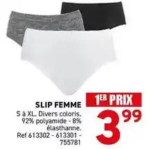 L'offre est disponible dans plusieurs magasins, vérifiez tous les produits pour obtenir le Slip femme le moins cher. Si vous souhaitez savoir si l'article est en vente avec une plus grosse remise dans un autre magasin, consultez la catégorie 'Grands magasins'. Ces offres pourraient aussi vous intéresser : Slip ou shorty femme, Dim - slip generous femme & Slip enfant.
