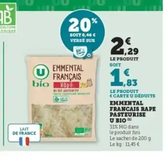 Actuellement en offre chez U Express : Emmental francais rape pasteurise u bio ✅ Valable du 20-01 au 1-02.