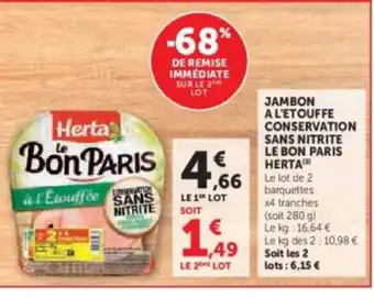 Le prix de l'offre HERTA Jambon a l'etouffe conservation sans nitrite le bon paris se trouve également en haut de la page, ainsi que la date à laquelle l'offre est disponible. Vous pouvez également vérifier les prix dans le Catalogue U Express actuel ou sur le site Internet de U Express. Les offres vous permettent d'acheter les produits U Express au prix le plus bas.