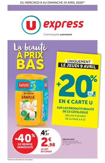Actuellement, TAHITI Douche est en promotion chez U Express. Toutes les informations utiles comme le prix, les conditions et la durée de validité sont affichées sur cette page. Consultez également les promotions similaires pour TAHITI Douche, afin de faire le meilleur choix. La promo TAHITI Douche est valable du 08-04-2026 au 19-04-2026. Si elle est expirée, regardez les autres offres équivalentes. Vous pouvez aussi suivre cette catégorie de produit pour être alerté lorsqu’une nouvelle promotion TAHITI Douche apparaît chez U Express.Questions fréquemment posées au sujet de TAHITI Douche