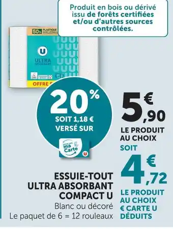 Offre U essuie-tout ultra absorbant compact chez U Express