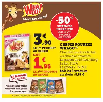 En plus de l'offre Whaou crêpes fourrées, U Express propose une large gamme de produits. Consultez le Catalogue U Express hebdomadaire pour découvrir les meilleures offres et promotions. En plus de Whaou crêpes fourrées, il y a aussi : Crêpes fourrées Prix choc WHAOU!, Crêpes fourrées prix choc whaou & CRÊPES “WHAOU!”.