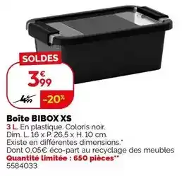 L'offre est disponible dans plusieurs magasins, vérifiez tous les produits pour obtenir le Boîte bibox xs le moins cher. Si vous souhaitez savoir si l'article est en vente avec une plus grosse remise dans un autre magasin, consultez la catégorie 'Bricolage'. Ces offres pourraient aussi vous intéresser : Boîte bibox xs, Boîte de rangement transparente xs & Carrefour - boîte de rangement transparente xs.