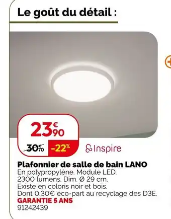 En plus de l'offre LANO Plafonnier de salle de bain, Weldom propose une large gamme de produits. Consultez le Catalogue Weldom hebdomadaire pour découvrir les meilleures offres et promotions. En plus de LANO Plafonnier de salle de bain, il y a aussi : Inspire plafonnier de salle de bain lano, Osram - applique salle de bain & Carrefour - nettoyant salle de bain expert.
