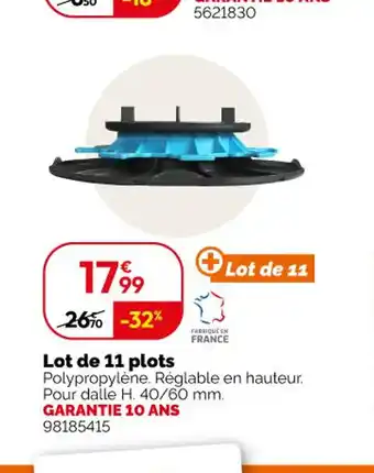 En plus de l'offre Lot de 11 plots, Weldom propose une large gamme de produits. Consultez le Catalogue Weldom hebdomadaire pour découvrir les meilleures offres et promotions. En plus de Lot de 11 plots, il y a aussi : Lot de 11 plots, Lot de 11 plots & 13 plots.
