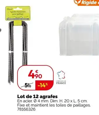 L'offre est disponible dans plusieurs magasins, vérifiez tous les produits pour obtenir le Lot de 12 agrafes le moins cher. Si vous souhaitez savoir si l'article est en vente avec une plus grosse remise dans un autre magasin, consultez la catégorie 'Bricolage'. Ces offres pourraient aussi vous intéresser : Lot de 12 agrafes, 10 agrafes métalliques & U lot de 3 plaques de 12 godets pour semis.