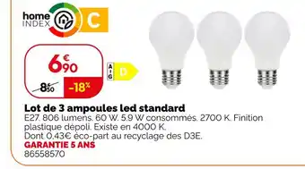 L'offre est disponible dans plusieurs magasins, vérifiez tous les produits pour obtenir le Lot de 3 ampoules led standard le moins cher. Si vous souhaitez savoir si l'article est en vente avec une plus grosse remise dans un autre magasin, consultez la catégorie 'Bricolage'. Ces offres pourraient aussi vous intéresser : Lot de 3 ampoules led standard à filament, OSRAM Lot de 4 ampoules led standards & LOT DE 4 AMPOULES LED STANDARDS OSRAM.