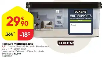 L'offre est disponible dans plusieurs magasins, vérifiez tous les produits pour obtenir le Peinture multisupports le moins cher. Si vous souhaitez savoir si l'article est en vente avec une plus grosse remise dans un autre magasin, consultez la catégorie 'Bricolage'. Ces offres pourraient aussi vous intéresser : LUXENS Peinture multisupports, Luxens peinture multisupports mat & Luxens peinture multisupports blanc satin.