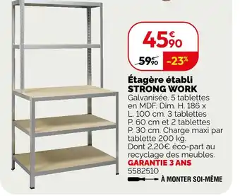 Dans quel magasin Strong work étagère établi sera-t-elle en promo la semaine prochaine ? C’est une question que l’on nous pose souvent. C’est normal, car personne ne souhaite payer plus que nécessaire. Notre équipe surveille toutes les promotions disponibles et les publie dès qu’elles sont connues. Vous pouvez donc ajuster votre liste de courses avec les offres actuelles ou celles de la semaine prochaine. Revenez souvent vérifier si Strong work étagère établi sera bientôt proposée avec une réduction avantageuse.Questions fréquemment posées au sujet de Strong work étagère établi