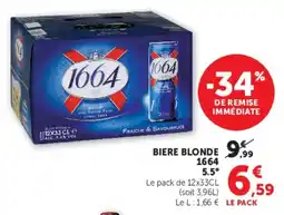 | 1664 biere blonde 5,5° | U Express | 9,80 € | 3,91 € | 5,89 € Réduction | 02 janvier 2024 | 14 janvier 2024 | |