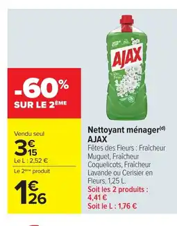 | AJAX Nettoyant ménager 1,5 l | Carrefour | 2,75 € | 1,10 € | -60% sur le 2eme | 17 juin 2025 | 01 juillet 2025 | |