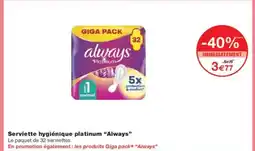 | 2 | ALWAYS Serviette hygiénique platinum | Monoprix | 6,29 € | 3,77 € | -40% | 01 janvier 2026 | 18 janvier 2026 | Voir l'offre | |