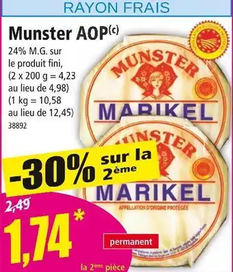 | Munster AOP 2 x 200 g | Norma | 2,49 € | 1,74 € | -30% sur la 2eme | 19 mars 2025 | 25 mars 2025 | |