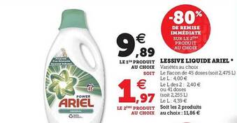| Ariel Lessive liquide XXL pack | U Express | 23,90 € | 14,34 € | 9,56 € Réduction | 06 octobre 2025 | 19 octobre 2025 | |