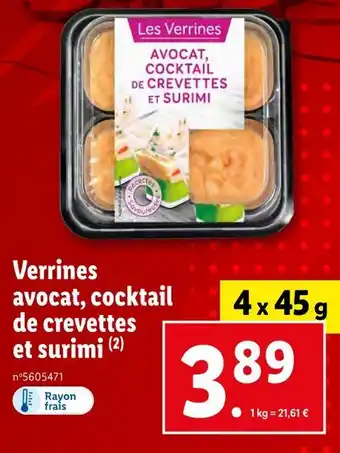 | Les verrines Verrines avocat, cocktail de crevettes et surimi | Lidl | 3,89 € | 06 février 2024 | 13 février 2024 | |||