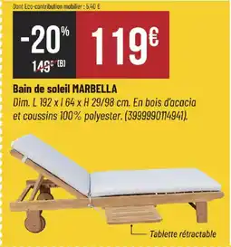 | Bain de soleil marbella | Bricorama | 149,00 € | 119,00 € | -20% | 22 avril 2026 | 03 mai 2026 | |