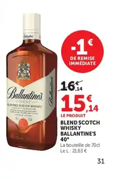 | BALLANTINE'S Blended scotch whisky 40° 70 cl | Super U | 15,90 € | 14,90 € | 1,00 € Réduction | 21 janvier 2025 | 02 février 2025 | |