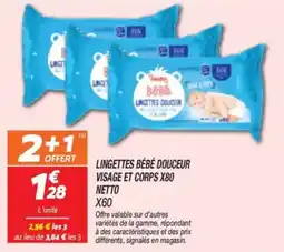 | Lingettes bébé douceur visage et corps x80 netto | Netto | 1,28 € | 2+1 offert | 06 janvier 2026 | 12 janvier 2026 | ||