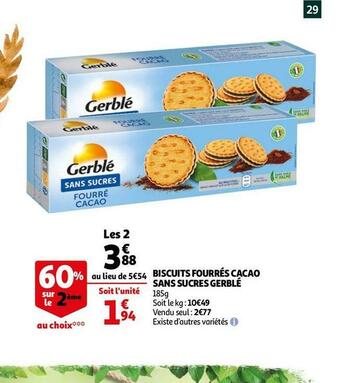 | Gerblé biscuits fourrés cacao sans sucres | Auchan | 4,70 € | 3,29 € | 1,41 € Réduction | 14 septembre 2022 | 20 septembre 2022 | |