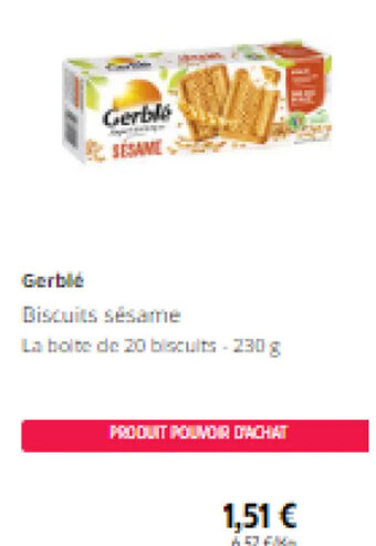 | Gerblo Biscuits sésame | Intermarché | 1,51 € | 13 septembre 2023 | 31 décembre 2023 | |||