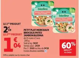 | Petit plat morceaux brocolis pates jambon bledina | Auchan | 2,59 € | 1,04 € | 60% SUR LE 2EME | 27 janvier 2026 | 08 février 2026 | |