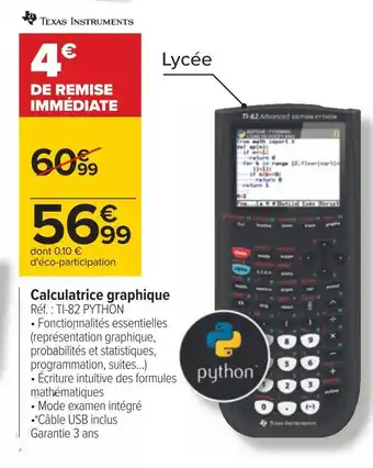 | TEXAS INSTRUMENT Calculatrice graphique | Carrefour | 61,99 € | 57,99 € | 4,00 € Réduction | 01 juillet 2024 | 22 juillet 2024 | |