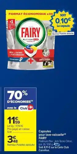 | 8 | Fairy - capsules pour lave- vaisselle pack xl | Carrefour Drive | 16,90 € | 5,07 € | 11,83 € Réduction | 24 février 2026 | 09 mars 2026 | Voir l'offre | |