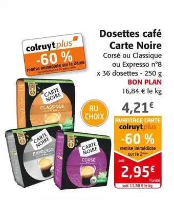 | Carte noire dosettes café | Colruyt | 4,21 € | 2,95 € | 1,26 € Réduction | 06 juin 2023 | 18 juin 2023 | |