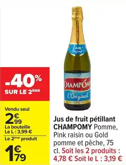 | Jus de fruit pétillant champomy 75 cl | Carrefour | 2,99 € | 1,79 € | -40% SUR LE 2ÈME | 20 janvier 2026 | 02 février 2026 | |