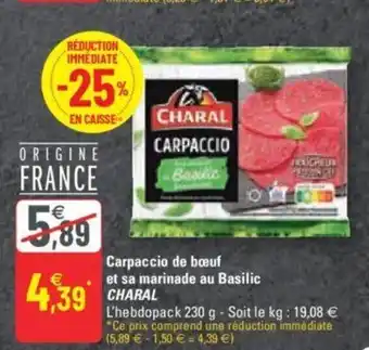| Charal Carpaccio de Bœuf Et Sa Marinade Au Basilic | G20 | 5,89 € | 4,39 € | 1,50 € Réduction | 07 septembre 2022 | 18 septembre 2022 | |