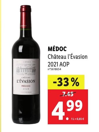 | MÉDOC Château l'Évasion 2021 AOP | Lidl | 7,45 € | 4,99 € | 2,46 € Réduction | 13 septembre 2023 | 19 septembre 2023 | |