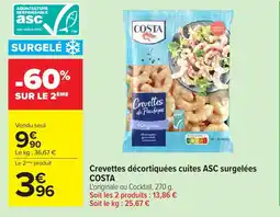 | Crevettes décortiquées cuites asc surgelées costa 270 g | Carrefour | 9,90 € | 3,96 € | 5,94 € Réduction | 21 avril 2026 | 04 mai 2026 | |